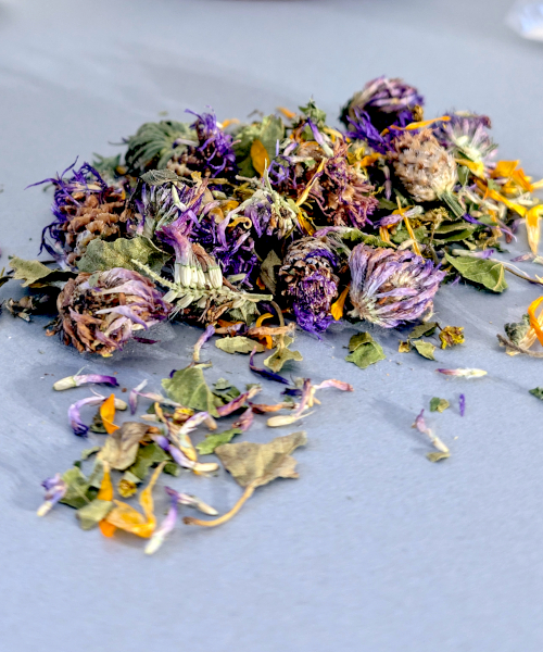 Maple flowers, birch leaves, red clover, burdock, calendula, hazelnut leaves.