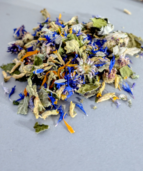 Peppermint leaves, apple leaves and flowers, raspberry leaves, cowslips, cornflowers, calendula.