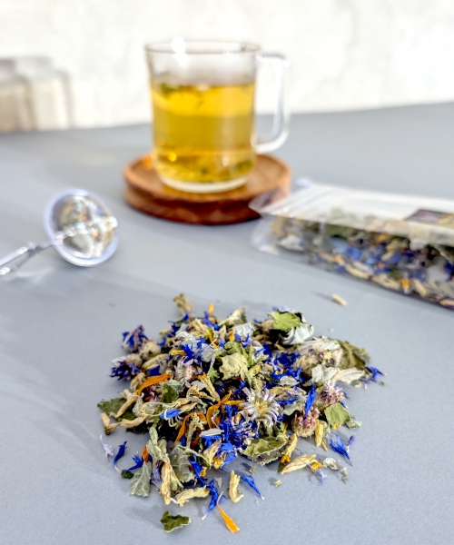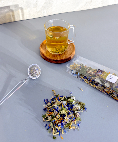 Place 1–2 teaspoons of the blend in a cup, pour boiling water over it, and let steep for 7–10 minutes. Add honey or lemon to taste – it will especially highlight the freshness of the peppermint and the delicacy of the flowers.